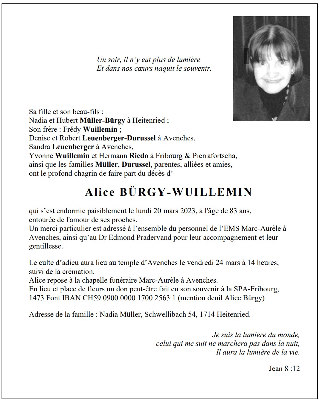 Alice BÜRGY-WUILLEMIN 01 déc. 1939 - 20 mar. 2023 Avis mortuaire PFG Télecharger PDF Partager sur: Galerie PreviousNext PreviousNext