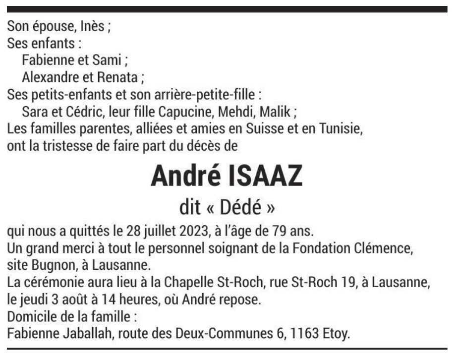 André ISAAZ dit « Dédé » 11 mar. 1944 - 28 juil. 2023 Avis mortuaire PFG Télecharger PDF Partager sur: Galerie PreviousNext PreviousNext