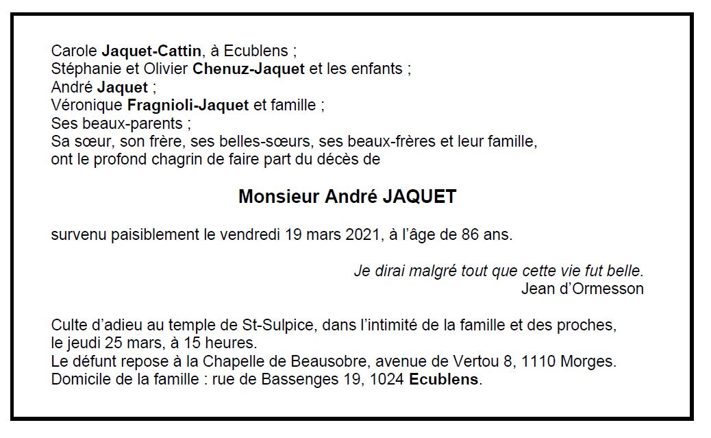 André JAQUET 19 mar. 2021 Avis mortuaire PFG Télecharger PDF Partager sur: Galerie PreviousNext PreviousNext