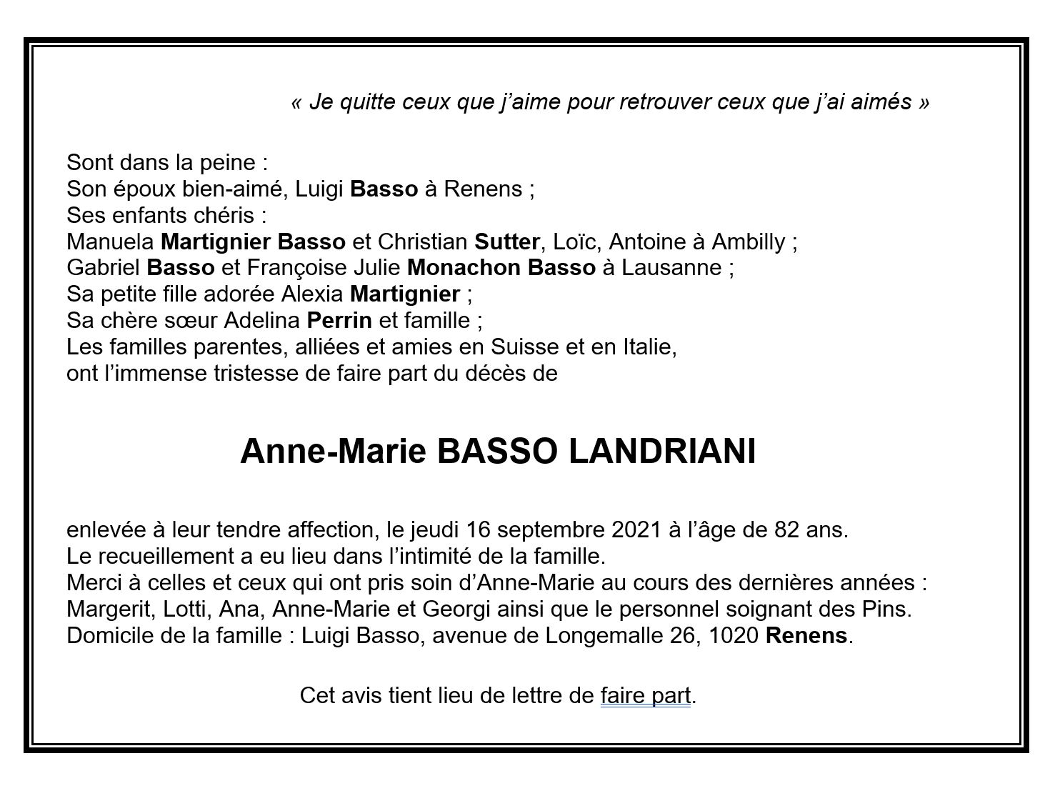 Anne-Marie BASSO LANDRIANI 21 juil. 1939 - 16 sep. 2021 Avis mortuaire PFG Télecharger PDF Partager sur: Galerie