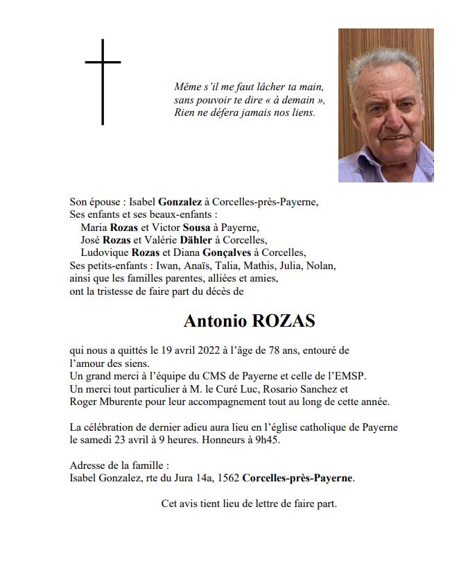 Antonio ROZAS 13 fév. 1944 - 19 avr. 2022 Avis mortuaire PFG Télecharger PDF Partager sur: Galerie PreviousNext PreviousNext