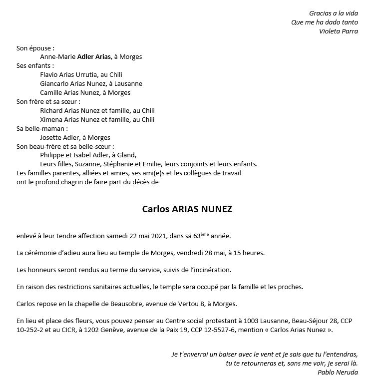 Carlos ARIAS NUNEZ 12 juil. 1957 - 22 mai. 2021 Avis mortuaire PFG Télecharger PDF Partager sur: Galerie PreviousNext PreviousNext