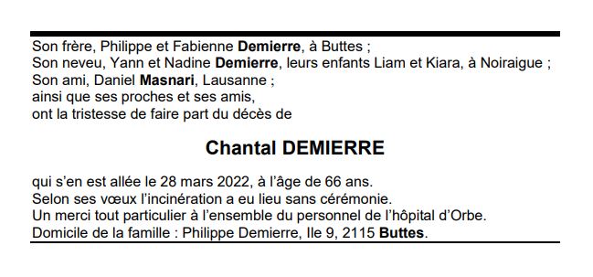 Chantal DEMIERRE 08 oct. 1955 - 28 mar. 2022 Avis mortuaire PFG Télecharger PDF Partager sur: Galerie PreviousNext PreviousNext