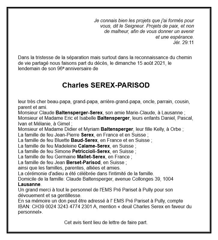 Charles SEREX-PARISOD 14 aoû. 1925 - 15 aoû. 2021 Avis mortuaire PFG Télecharger PDF Partager sur: Galerie PreviousNext PreviousNext