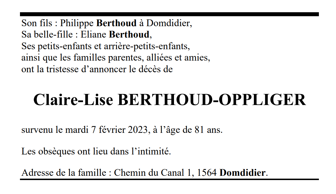 Claire-Lise BERTHOUD-OPPLIGER 21 mai. 1941 - 07 fév. 2023 Avis mortuaire PFG Télecharger PDF Partager sur: Galerie