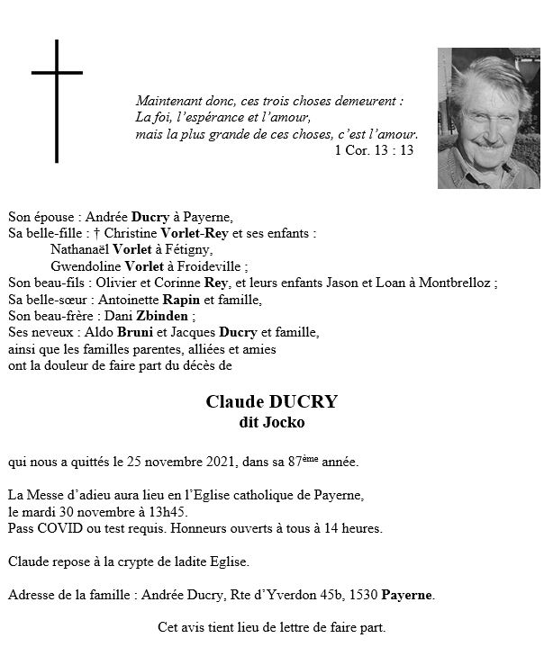 Claude DUCRY 15 juin. 1935 - 25 nov. 2021 Avis mortuaire PFG Télecharger PDF Partager sur: Galerie PreviousNext PreviousNext