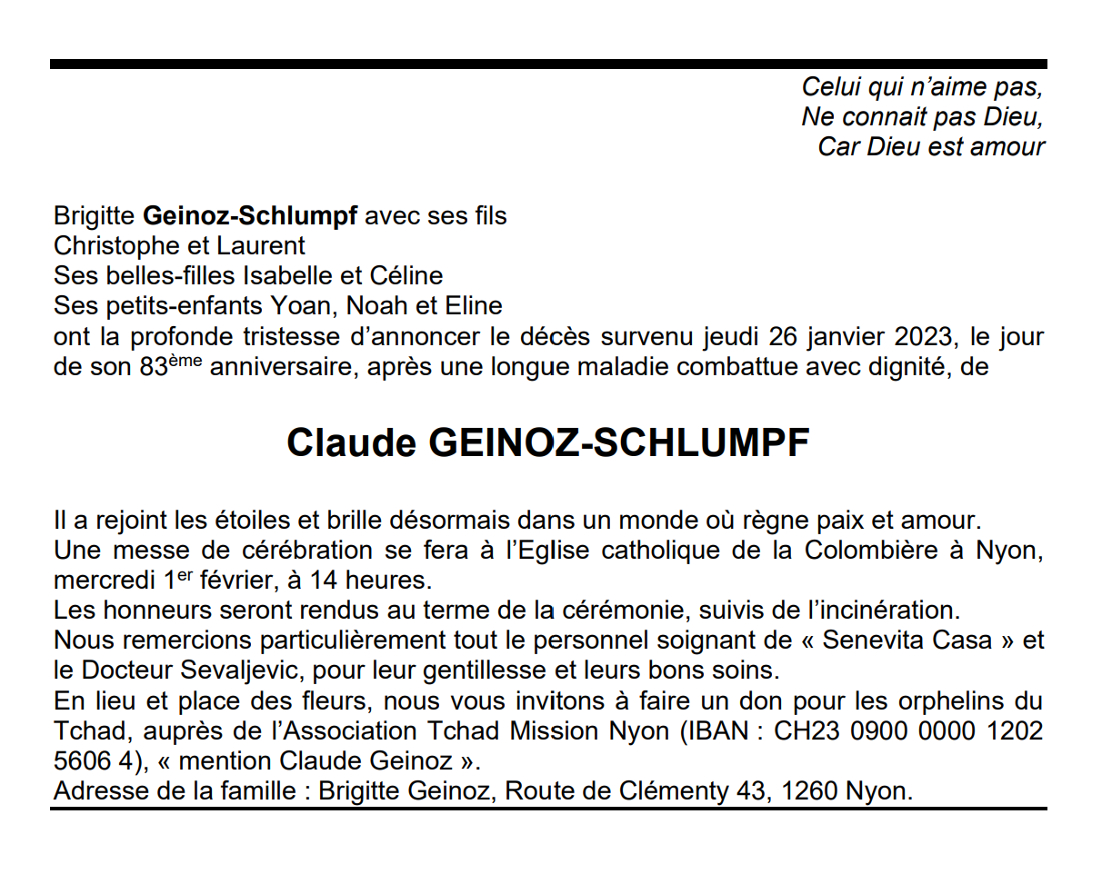 Claude GEINOZ-SCHLUMPF 26 jan. 2023 Avis mortuaire PFG Télecharger PDF Partager sur: Galerie PreviousNext PreviousNext