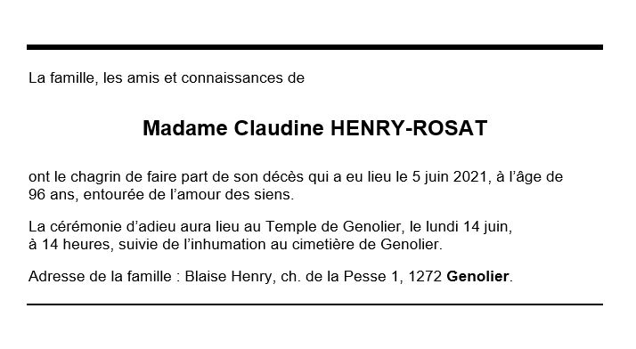 Claudine HENRY-ROSAT 02 aoû. 1924 - 05 juin. 2021 Avis mortuaire PFG Télecharger PDF Partager sur: Galerie PreviousNext PreviousNext