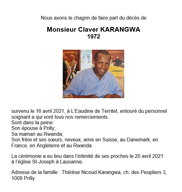 Claver KARANGWA 12 avr. 1972 - 16 avr. 2021 Avis mortuaire PFG Télecharger PDF Partager sur: Galerie PreviousNext PreviousNext