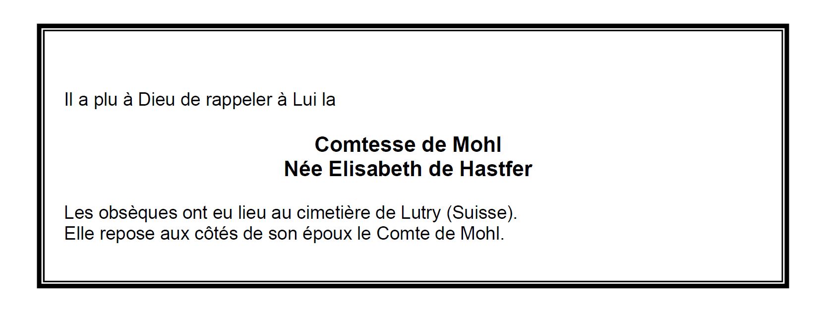 Comtesse de Mohl Née Elisabeth de Hastfer 29 avr. 1921 - 03 oct. 2021 Avis mortuaire PFG Télecharger PDF Partager sur: Galerie PreviousNext PreviousNext