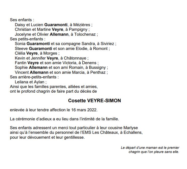 Cosette VEYRE-SIMON 13 déc. 1933 - 16 mar. 2022 Avis mortuaire PFG Télecharger PDF Partager sur: Galerie