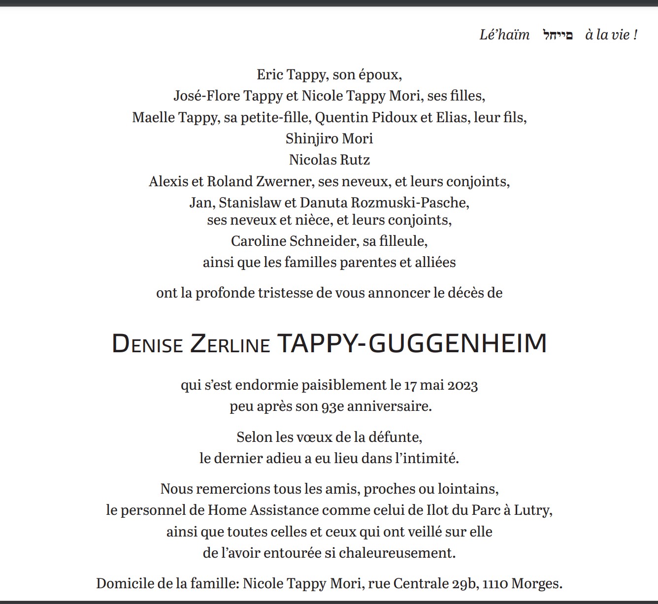 Denise Zerline TAPPY-GUGGENHEIM 03 mai. 1930 - 17 mai. 2023 Avis mortuaire PFG Télecharger PDF Partager sur: Galerie PreviousNext PreviousNext