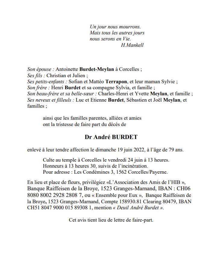 Dr André BURDET 27 mar. 1943 - 19 juin. 2022 Avis mortuaire PFG Télecharger PDF Partager sur: Galerie PreviousNext PreviousNext