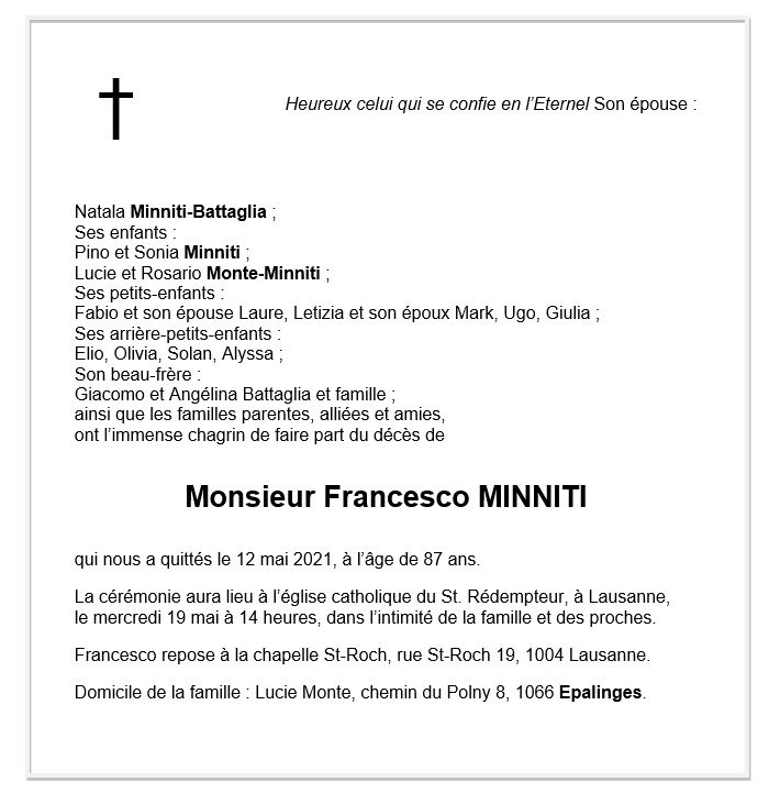 Francesco MINNITI 03 jan. 1934 - 12 mai. 2021 Avis mortuaire PFG Télecharger PDF Partager sur: Galerie PreviousNext PreviousNext