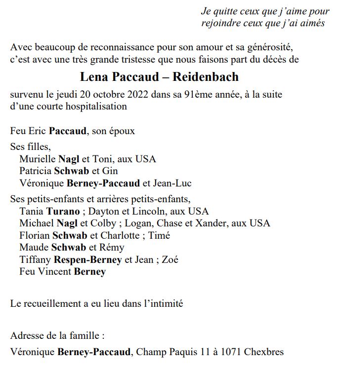 Lena Paccaud – Reidenbach 24 avr. 1932 - 20 oct. 2022 Avis mortuaire PFG Télecharger PDF Partager sur: Galerie PreviousNext PreviousNext
