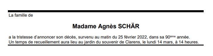Madame Agnès SCHÄR 21 sep. 1932 - 25 fév. 2022 Avis mortuaire PFG Télecharger PDF Partager sur: Galerie PreviousNext PreviousNext