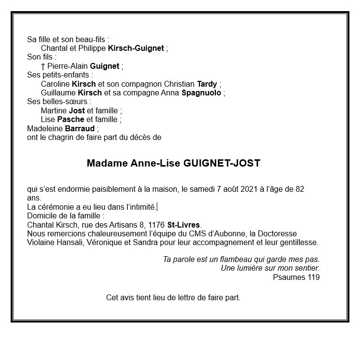 Madame Anne-Lise GUIGNET-JOST 23 fév. 1939 - 07 aoû. 2021 Avis mortuaire PFG Télecharger PDF Partager sur: Galerie PreviousNext PreviousNext