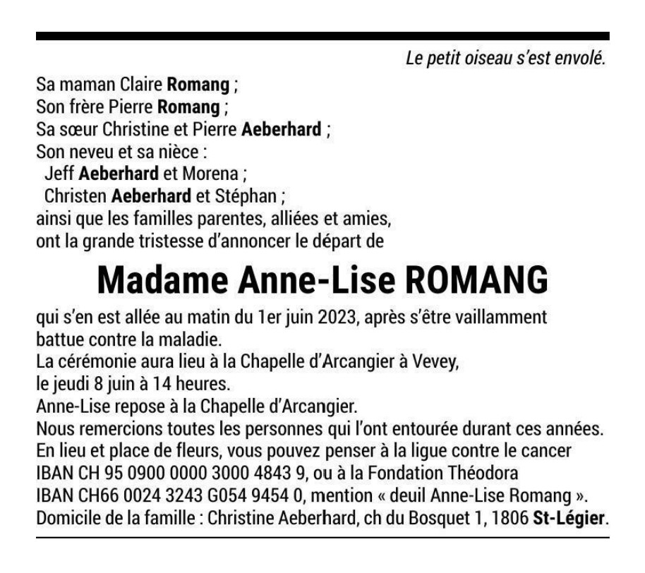 Madame Anne-Lise ROMANG 14 aoû. 1953 - 01 juin. 2023 Avis mortuaire PFG Télecharger PDF Partager sur: Galerie PreviousNext PreviousNext
