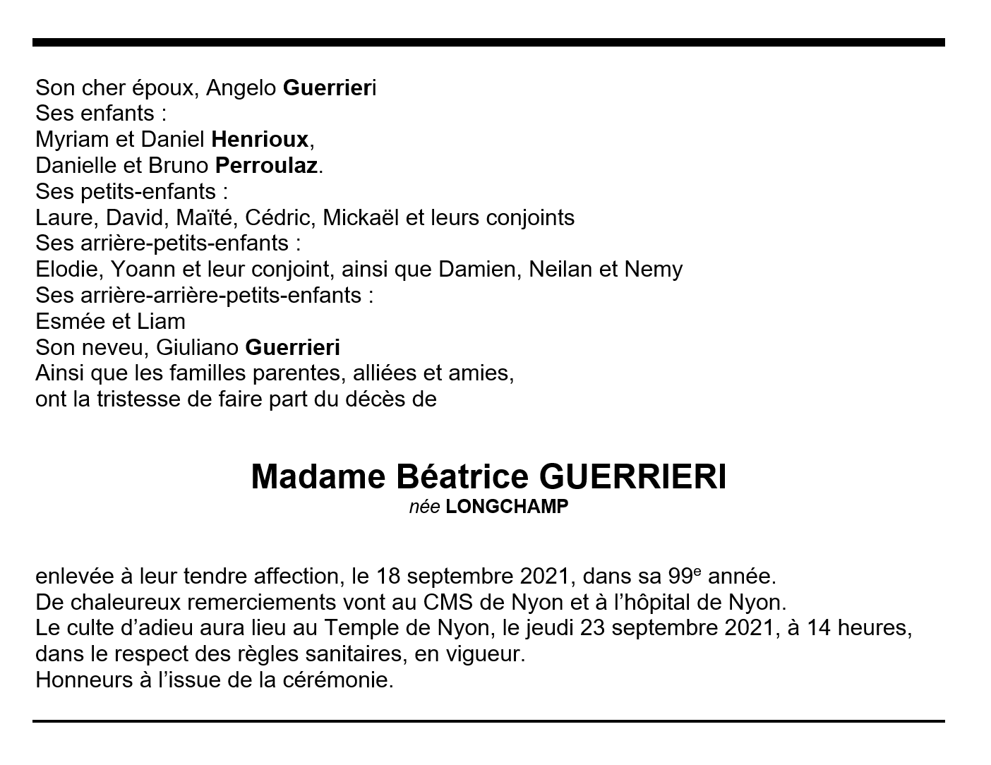 Madame Béatrice GUERRIERI 05 avr. 1924 - 18 sep. 2021 Avis mortuaire PFG Télecharger PDF Partager sur: Galerie PreviousNext PreviousNext