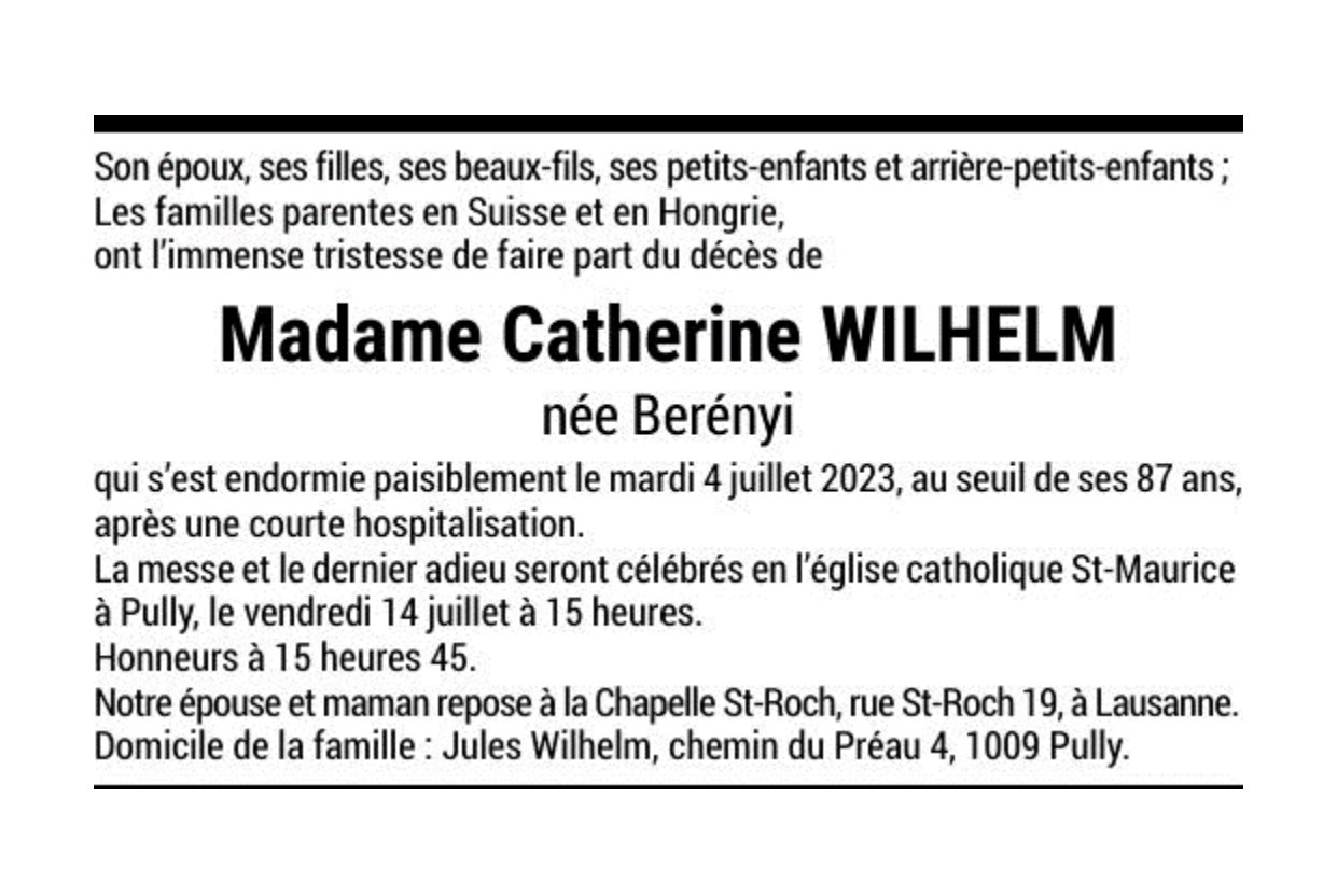 Madame Catherine WILHELM née Berényi 05 aoû. 1936 - 04 juil. 2023 Avis mortuaire PFG Télecharger PDF Partager sur: Galerie PreviousNext PreviousNext