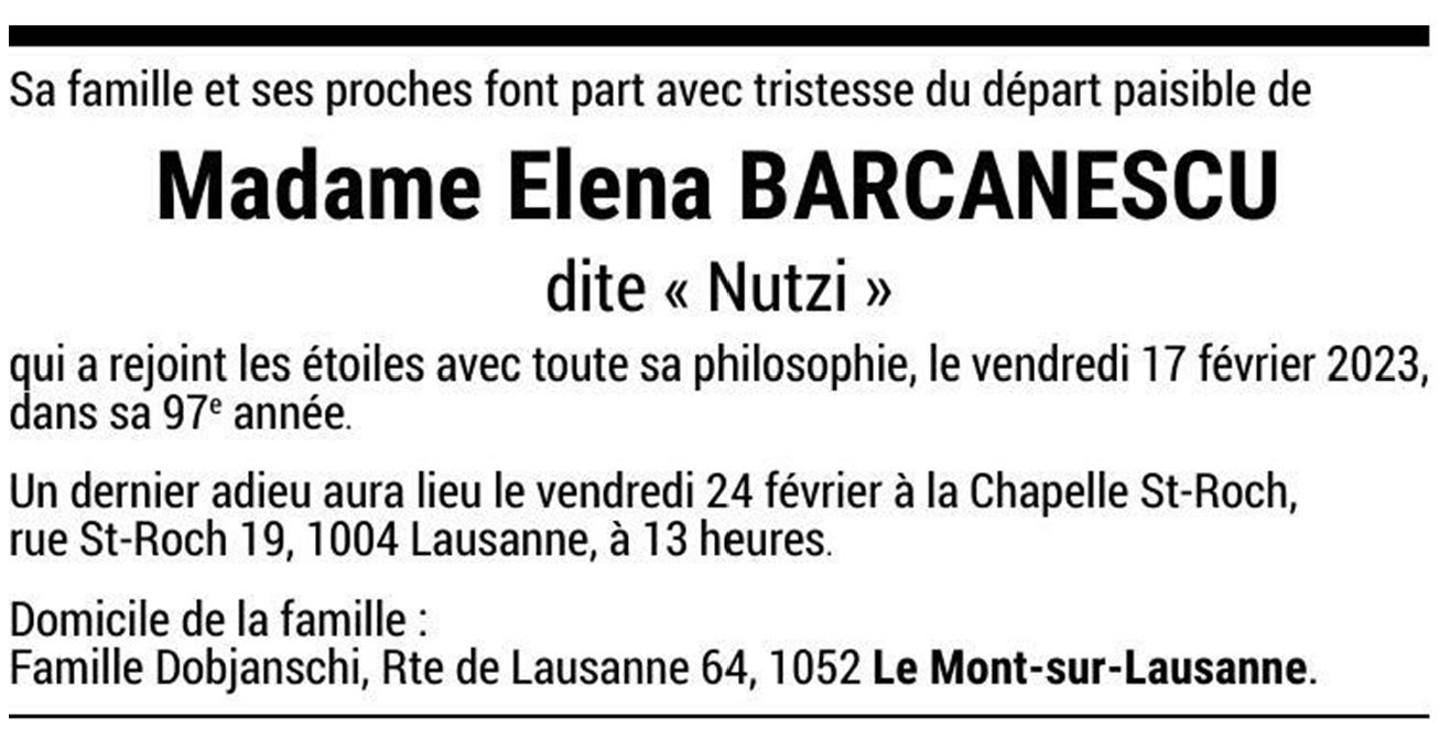 Madame Elena BARCANESCU 22 jan. 1927 - 17 fév. 2023 Avis mortuaire PFG Télecharger PDF Partager sur: Galerie PreviousNext PreviousNext