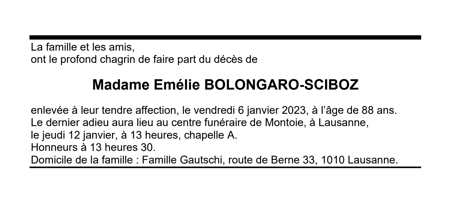 Madame Emélie BOLONGARO-SCIBOZ 22 juin. 1934 - 06 jan. 2023 Avis mortuaire PFG Télecharger PDF Partager sur: Galerie PreviousNext PreviousNext