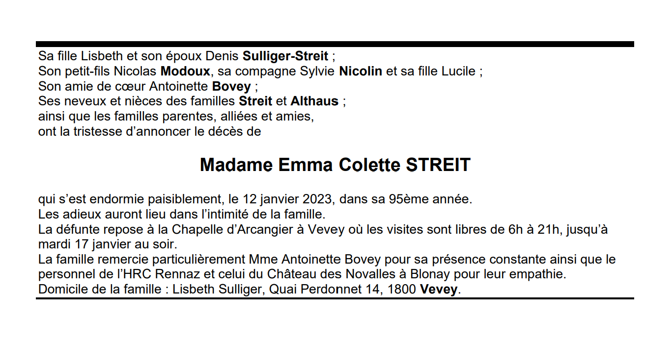 Madame Emma Colette STREIT 12 nov. 1928 - 12 jan. 2023 Avis mortuaire PFG Télecharger PDF Partager sur: Galerie PreviousNext PreviousNext