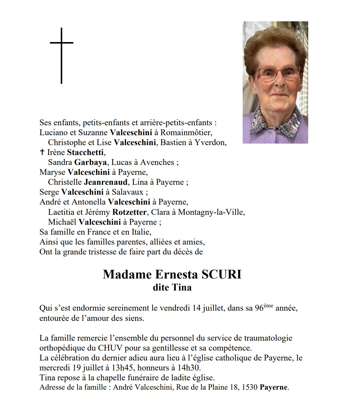Madame Ernesta SCURI dite Tina 27 avr. 1928 - 14 juil. 2023 Avis mortuaire PFG Télecharger PDF Partager sur: Galerie PreviousNext PreviousNext