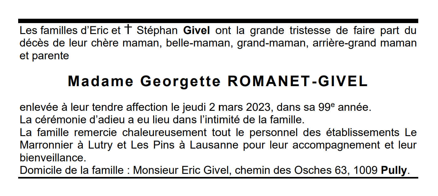 Madame Georgette ROMANET-GIVEL 19 mar. 1924 - 02 mar. 2023 Avis mortuaire PFG Télecharger PDF Partager sur: Galerie