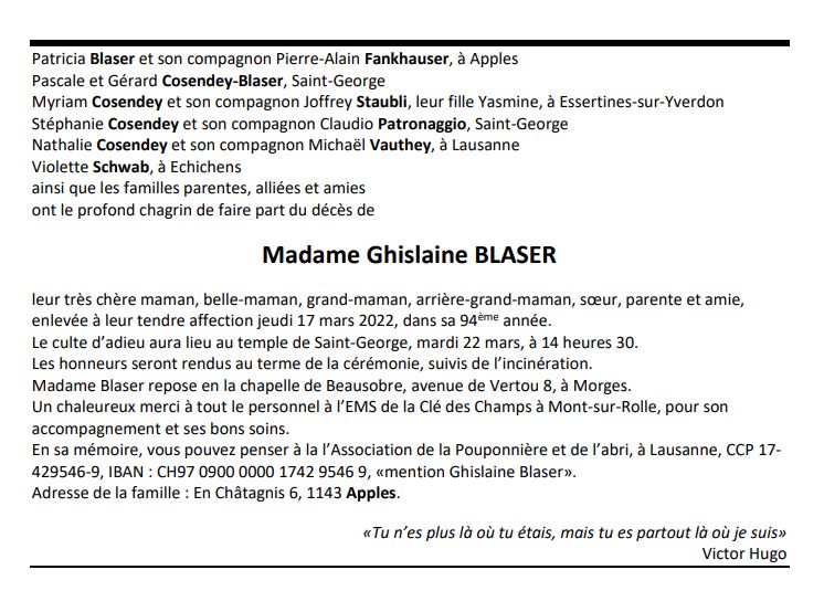 Madame Ghislaine BLASER 19 avr. 1928 - 17 mar. 2022 Avis mortuaire PFG Télecharger PDF Partager sur: Galerie PreviousNext PreviousNext