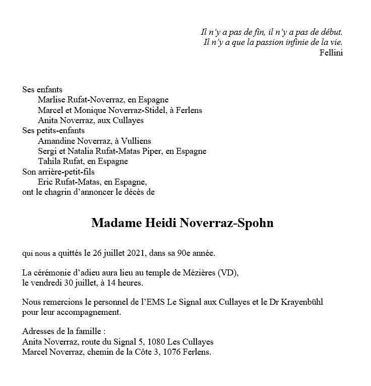 Madame Heidi NOVERRAZ-SPOHN 22 aoû. 1931 - 26 juil. 2021 Avis mortuaire PFG Télecharger PDF Partager sur: Galerie PreviousNext PreviousNext
