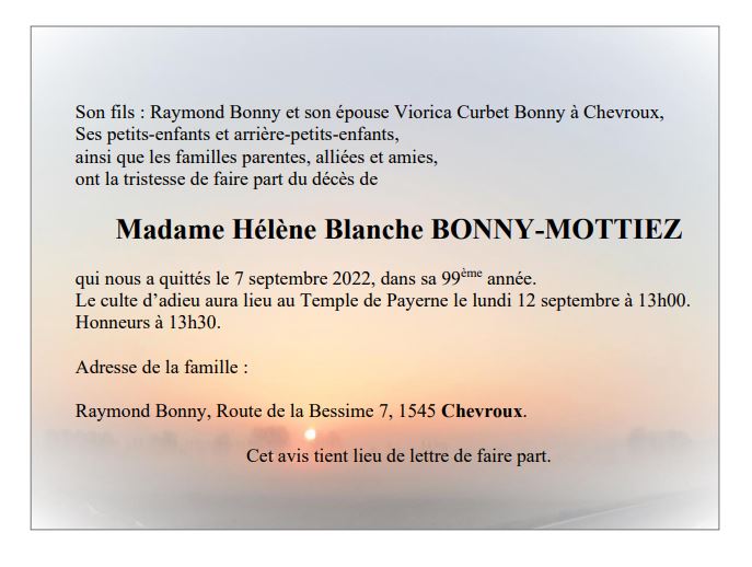 Madame Hélène Blanche BONNY-MOTTIEZ 11 nov. 1923 - 07 sep. 2022 Avis mortuaire PFG Télecharger PDF Partager sur: Galerie PreviousNext PreviousNext