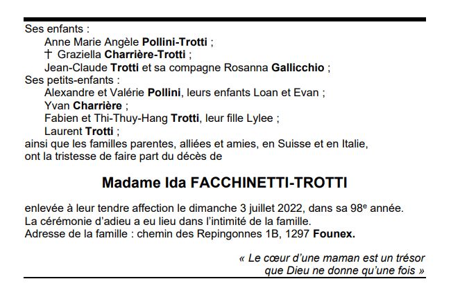 Madame Ida FACCHINETTI-TROTTI 17 nov. 1924 - 03 juil. 2022 Avis mortuaire PFG Télecharger PDF Partager sur: Galerie PreviousNext PreviousNext