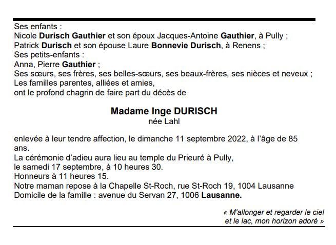 Madame Inge DURISCH 11 mai. 1937 - 11 sep. 2022 Avis mortuaire PFG Télecharger PDF Partager sur: Galerie PreviousNext PreviousNext