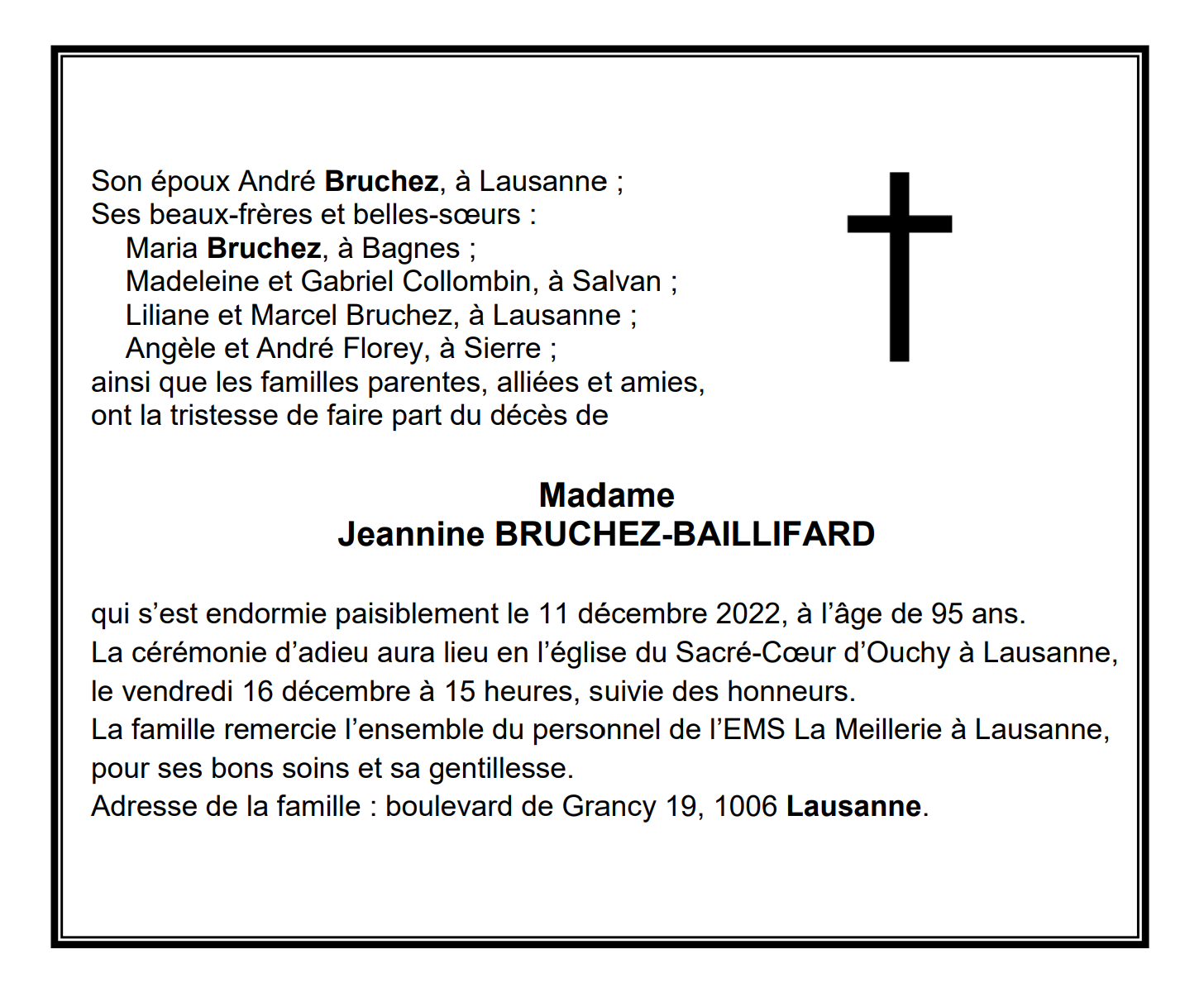 Madame Jeannine BRUCHEZ-BAILLIFARD 22 juil. 1927 - 11 déc. 2022 Avis mortuaire PFG Télecharger PDF Partager sur: Galerie PreviousNext PreviousNext