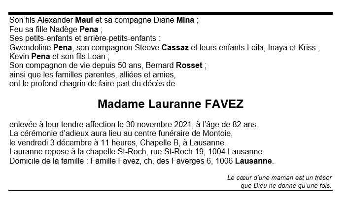 Madame Lauranne FAVEZ 09 fév. 1939 - 30 nov. 2021 Avis mortuaire PFG Télecharger PDF Partager sur: Galerie PreviousNext PreviousNext