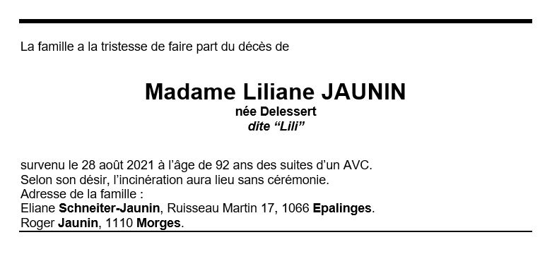 Madame Liliane JAUNIN 13 fév. 1929 - 28 aoû. 2021 Avis mortuaire PFG Télecharger PDF Partager sur: Galerie PreviousNext PreviousNext
