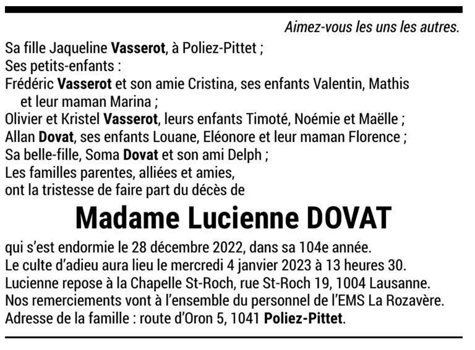 Madame Lucienne DOVAT 15 aoû. 1919 - 28 déc. 2022 Avis mortuaire PFG Télecharger PDF Partager sur: Galerie PreviousNext PreviousNext