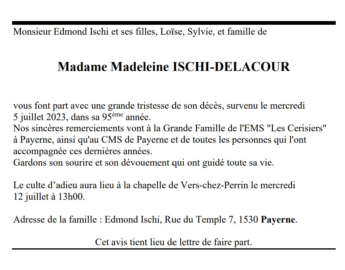 Madame Madeleine ISCHI-DELACOUR 24 nov. 1928 - 05 juil. 2023 Avis mortuaire PFG Télecharger PDF Partager sur: Galerie PreviousNext PreviousNext