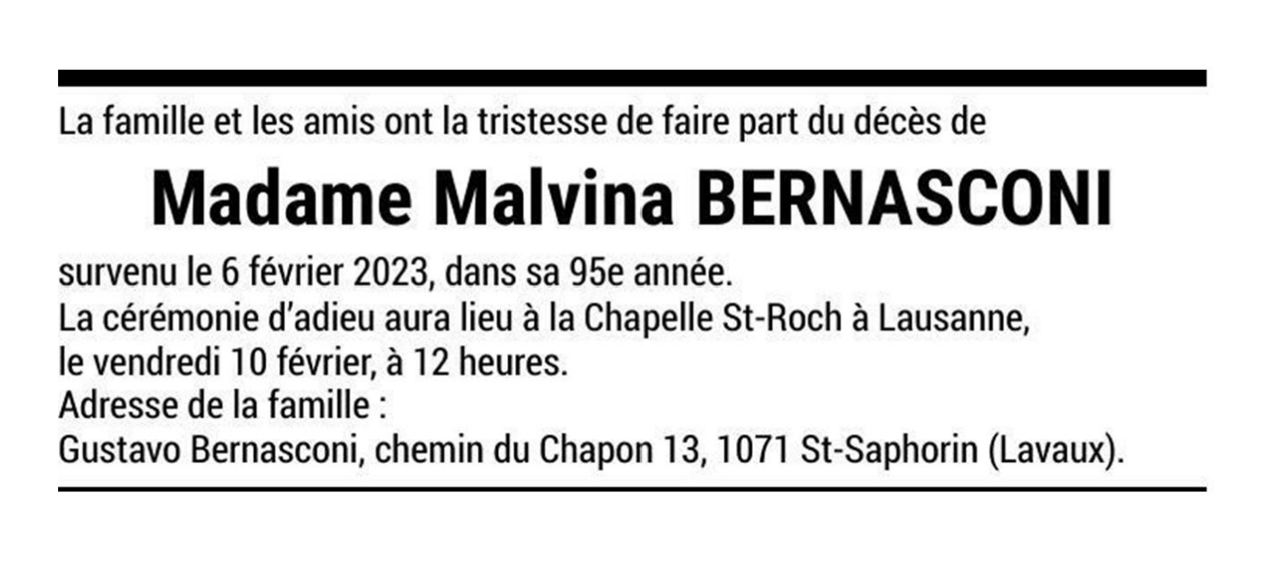 Madame Malvina BERNASCONI 19 juin. 1928 - 06 fév. 2023 Avis mortuaire PFG Télecharger PDF Partager sur: Galerie PreviousNext PreviousNext