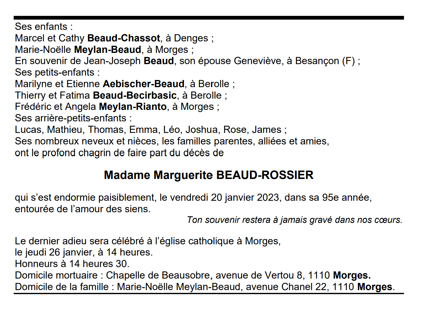 Madame Marguerite BEAUD-ROSSIER 06 déc. 1928 - 20 jan. 2023 Avis mortuaire PFG Télecharger PDF Partager sur: Galerie PreviousNext PreviousNext