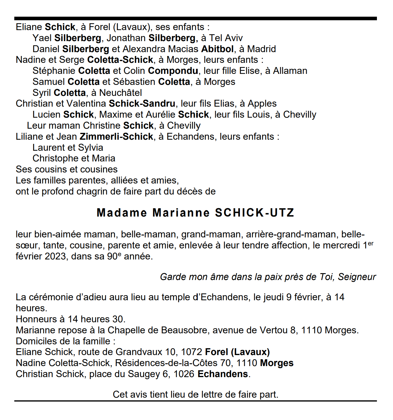 Madame Marianne SCHICK-UTZ 29 aoû. 1933 - 01 fév. 2023 Avis mortuaire PFG Télecharger PDF Partager sur: Galerie PreviousNext PreviousNext