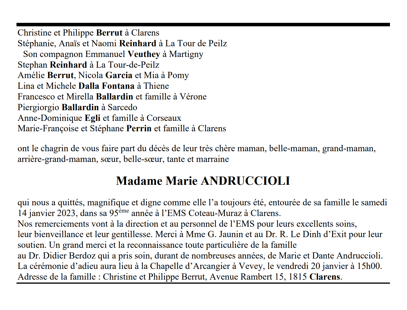 Madame Marie ANDRUCCIOLI 26 mar. 1928 - 14 jan. 2023 Avis mortuaire PFG Télecharger PDF Partager sur: Galerie PreviousNext PreviousNext