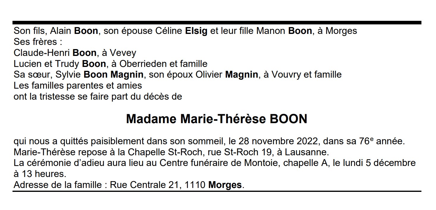 Madame Marie-Thérèse BOON 31 juil. 1947 - 28 nov. 2022 Avis mortuaire PFG Télecharger PDF Partager sur: Galerie PreviousNext PreviousNext