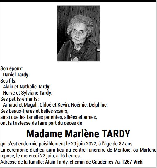 Madame Marlène TARDY 01 avr. 1940 - 20 juin. 2022 Avis mortuaire PFG Télecharger PDF Partager sur: Galerie PreviousNext PreviousNext