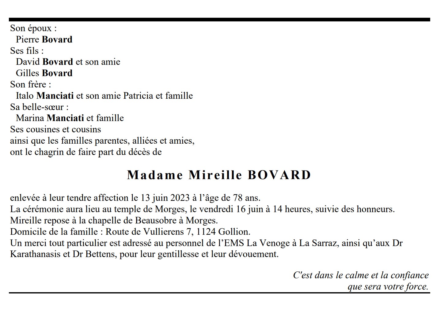 Madame Mireille BOVARD 22 avr. 1945 - 13 juin. 2023 Avis mortuaire PFG Télecharger PDF Partager sur: Galerie PreviousNext PreviousNext