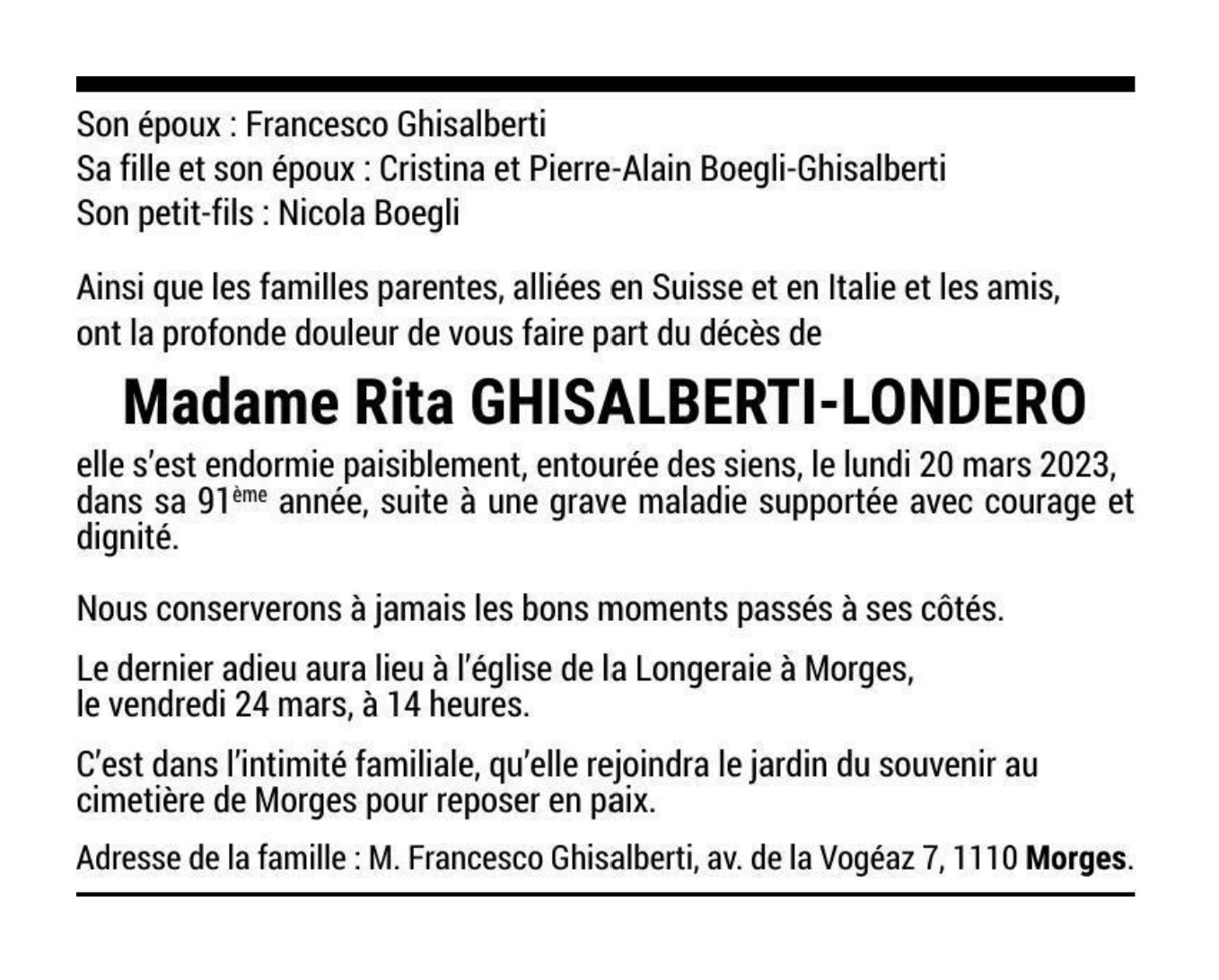 Madame Rita GHISALBERTI-LONDERO 16 nov. 1932 - 20 mar. 2023 Avis mortuaire PFG Télecharger PDF Partager sur: Galerie PreviousNext PreviousNext