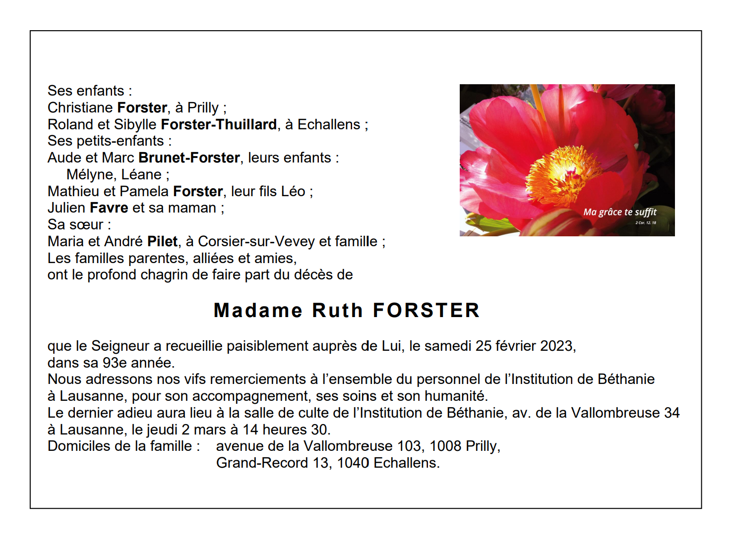 Madame Ruth FORSTER 27 sep. 1930 - 25 fév. 2023 Avis mortuaire PFG Télecharger PDF Partager sur: Galerie