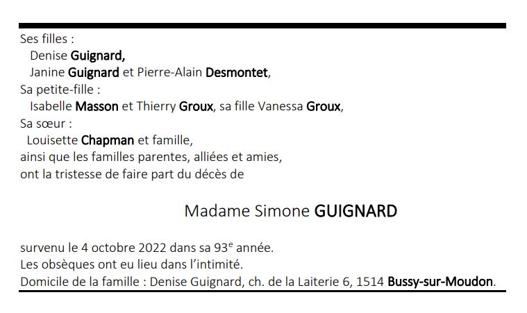 Madame Simone GUIGNARD 30 déc. 1929 - 04 oct. 2022 Avis mortuaire PFG Télecharger PDF Partager sur: Galerie