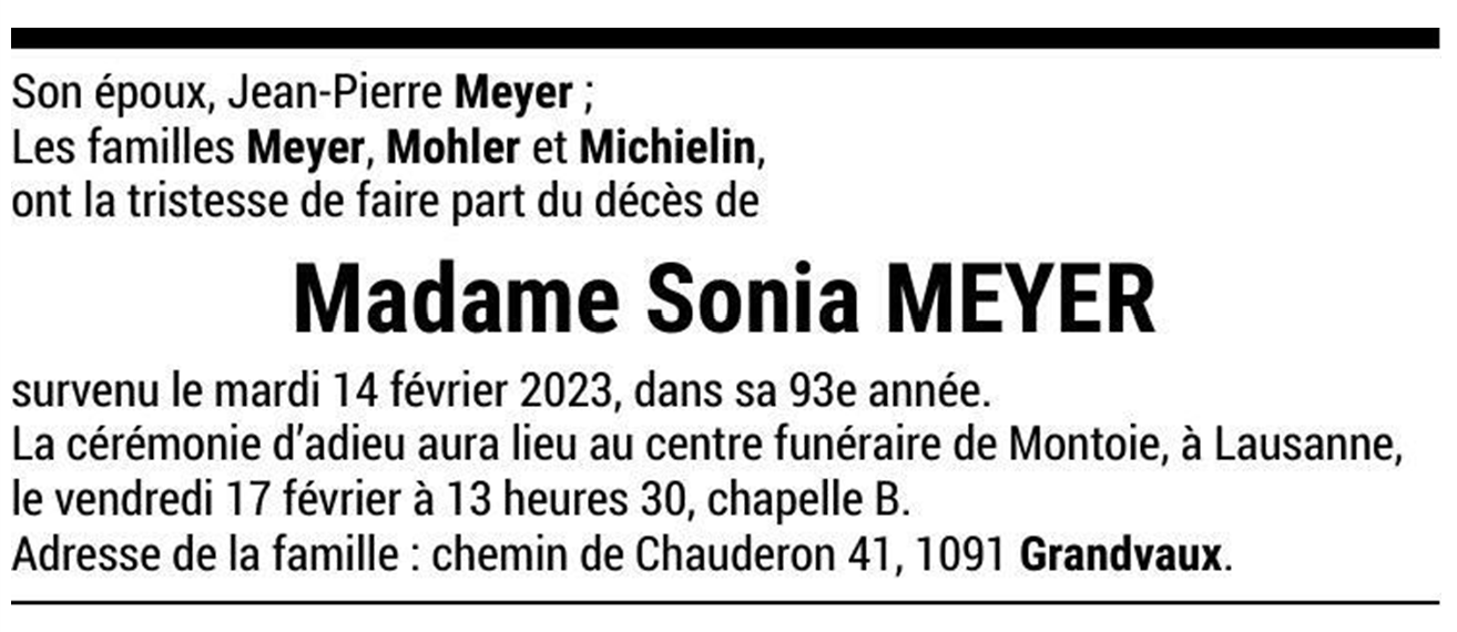 Madame Sonia MEYER 16 juin. 1930 - 14 fév. 2023 Avis mortuaire PFG Télecharger PDF Partager sur: Galerie PreviousNext PreviousNext